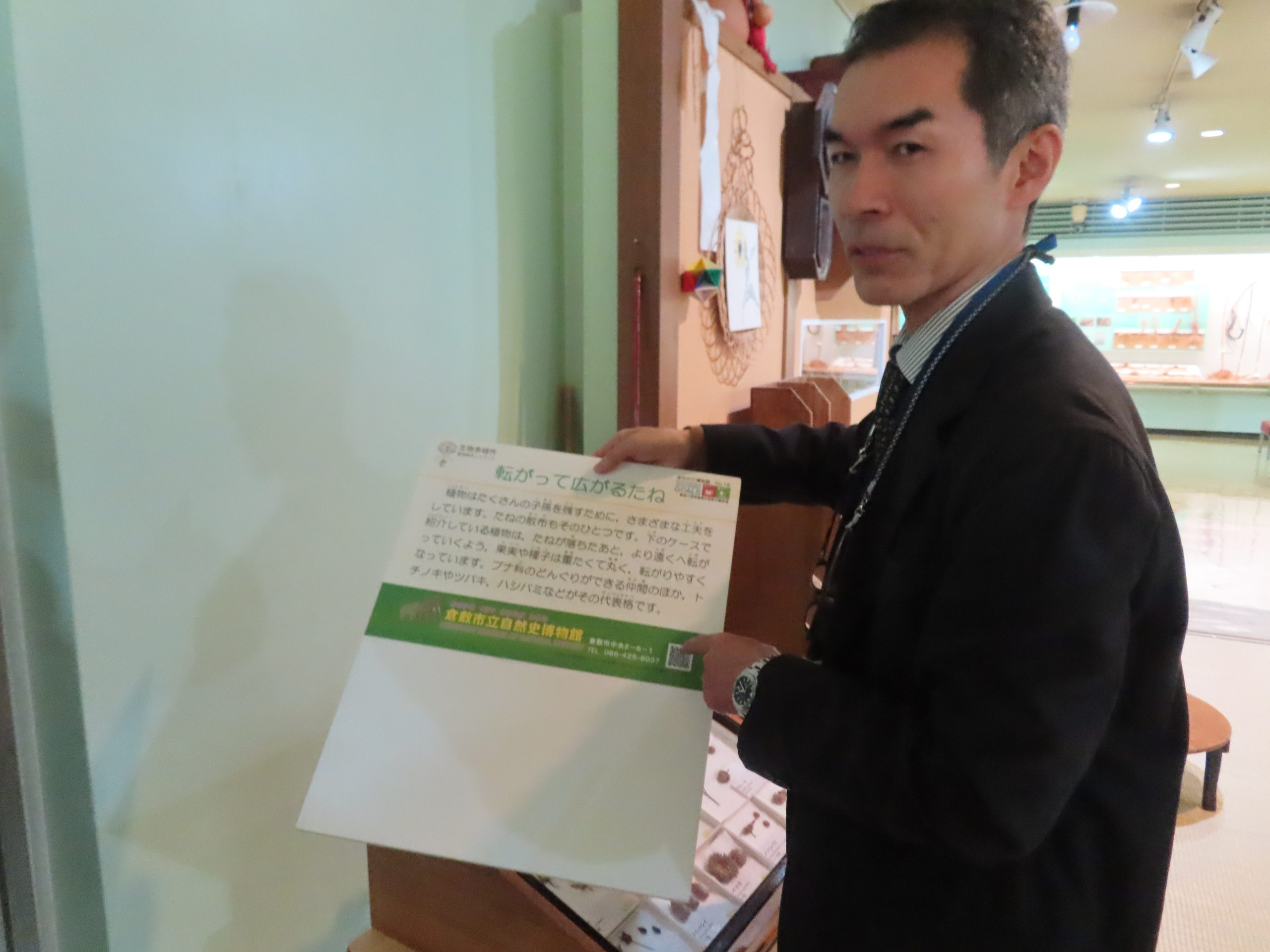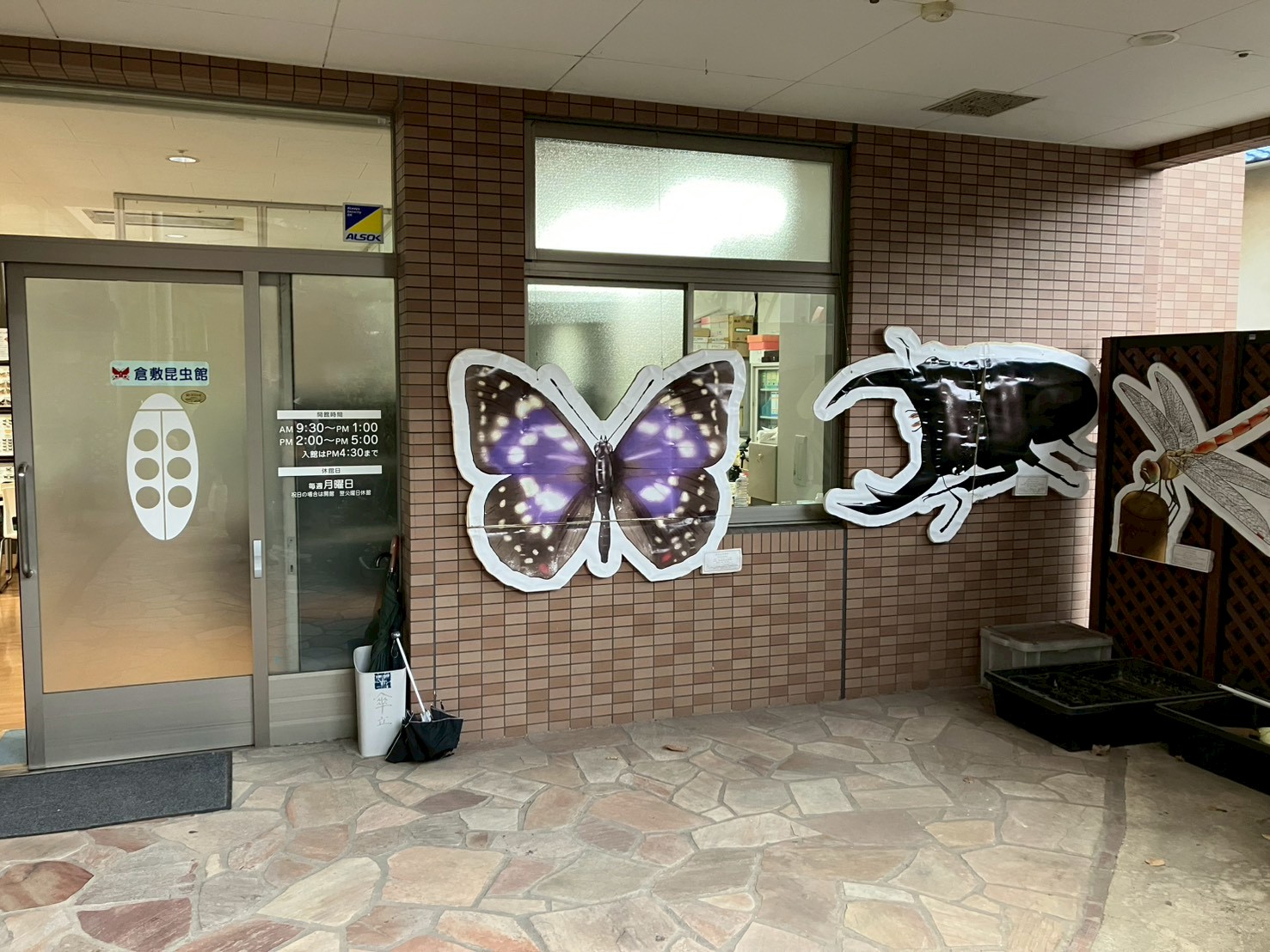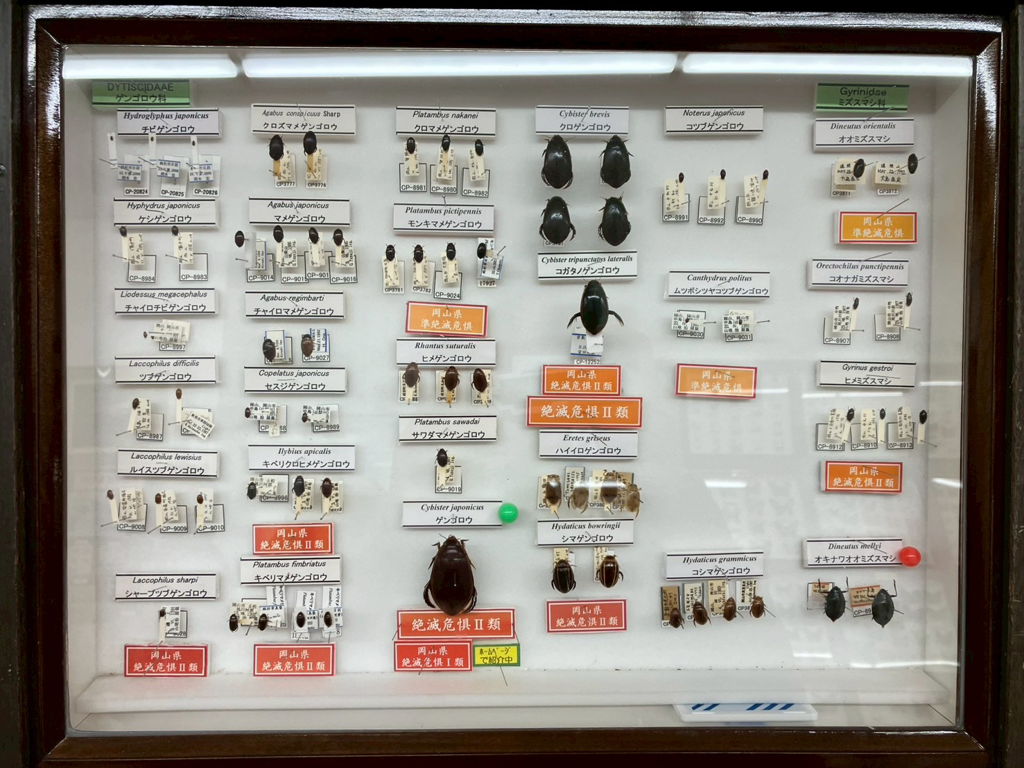 2日目の最初に訪問した倉敷昆虫館は、病院敷地内という特徴的な立地にありました。入口のビオトープで確認された生き物を展示に活用したり、地域の折り紙作家による昆虫折り紙の展示など、地域に根差したものもあり、標本以外でも興味を惹く展示が印象的でした。館内展示は、絶滅危惧種や岡山県内初記録の標本には色分けされたマークが付され、ジャンルごとに番号で整理されているなど、分かりやすい展示が徹底されていました。中でも印象に残ったのは、「構造色」という専門用語を、孔雀の羽やCDなど身近な素材を用いて解説する展示で、ユニークで真似したいものでした。
