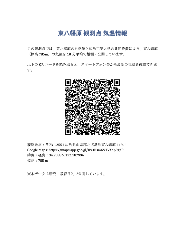 この度、広島工業大学と、高原の自然館の共同により、「東八幡原 観測点」として、気温計が設置されました!
