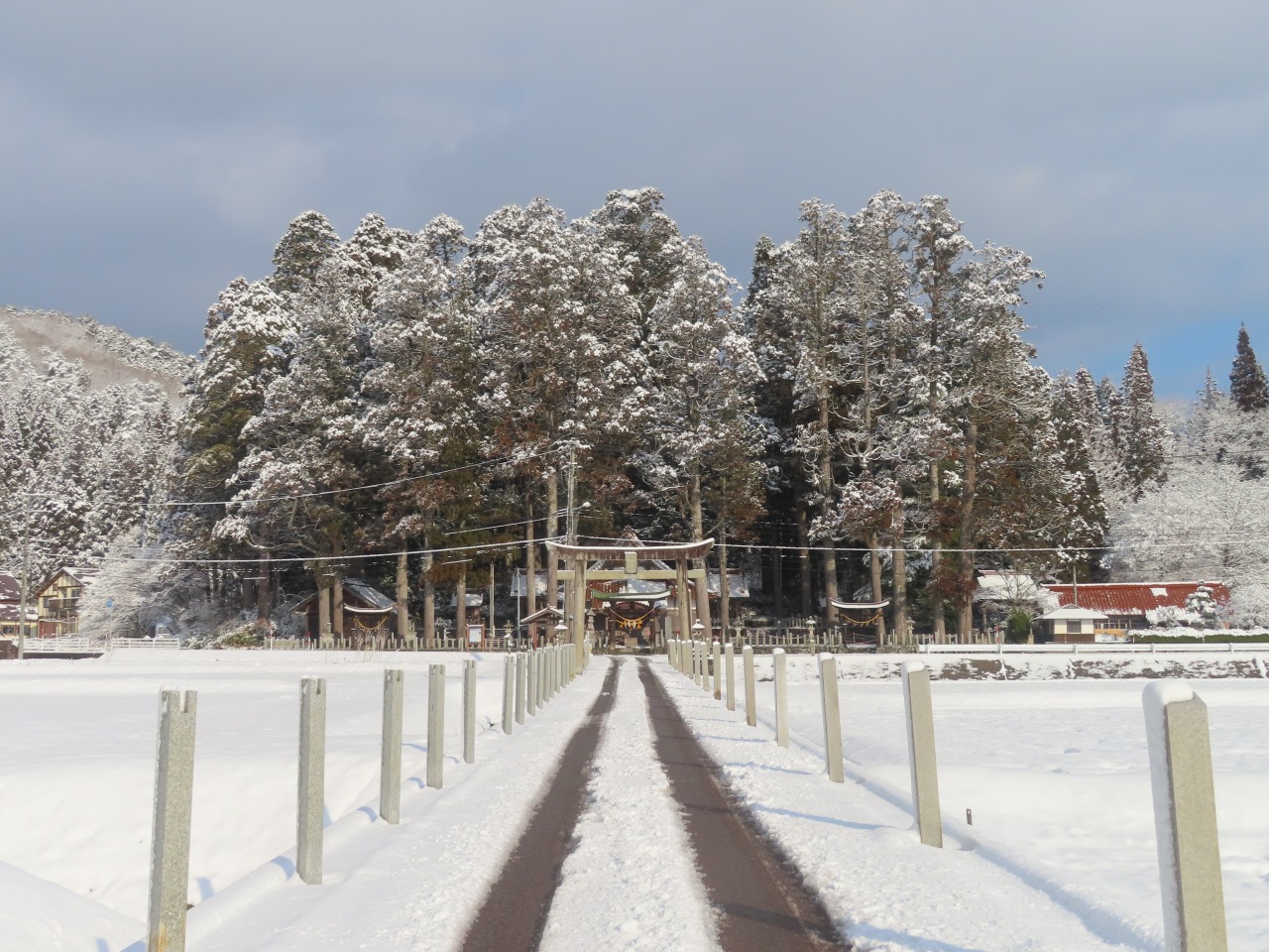 亀山八幡神社の鳥居や社叢にも、しっかりと積雪。
