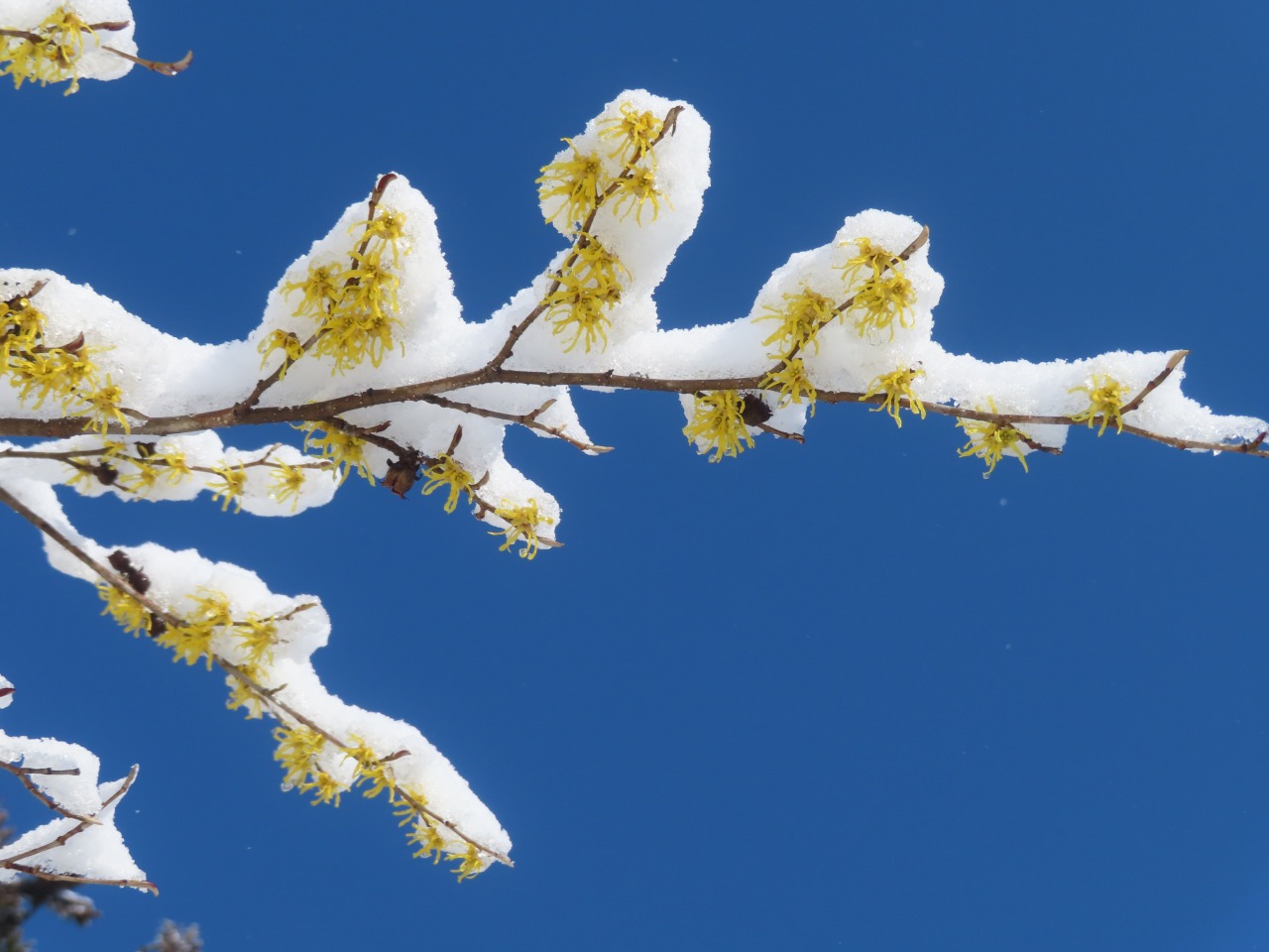 春を告げるアテツマンサクの黄色い花にも真っ白な雪。