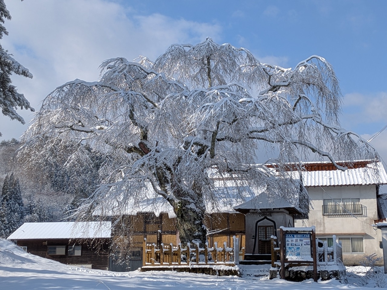樹齢400年以上の地久院のしだれざくらも、雪の花が満開。