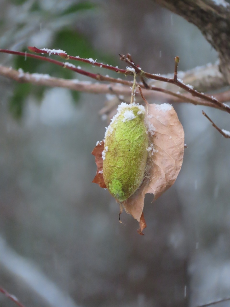 8月、9月に羽化して成虫となり、卵で越冬するので、この繭は空。