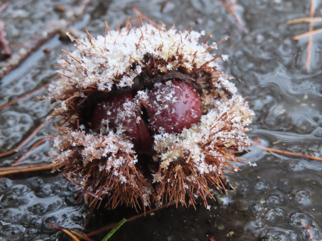 足元には、うっすらと雪を被ったイガグリが。