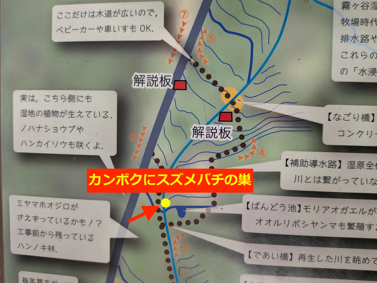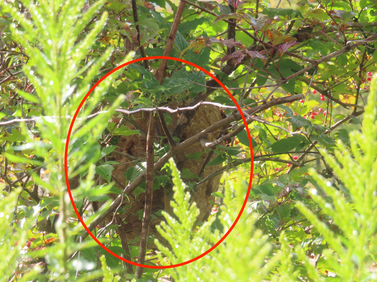 霧ヶ谷湿原の木道近くのカンボクの木に、巨大なスズメバチの巣を確認しています。