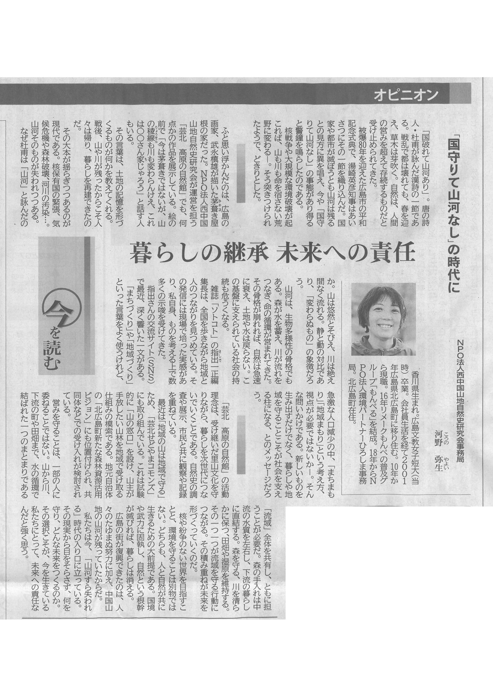 中国新聞のオピニオン面「今を読む」(2025/9/13 朝刊)で、西中国山地自然史研究会のスタッフ 河野 弥生の記事が掲載されました。(承諾:転W-1685)