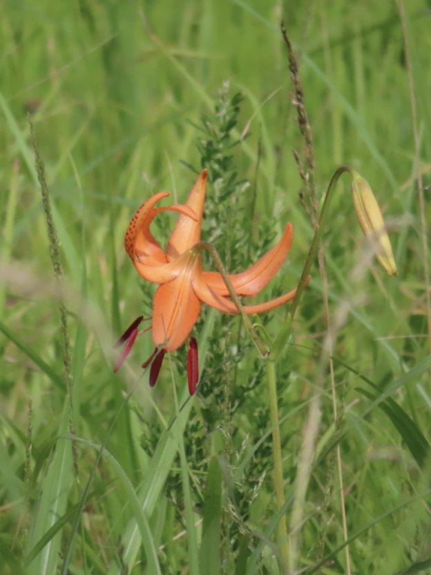 緑の中に目立つオレンジ色のコオニユリ。そっくりさんのオニユリとの見分け方は、ムカゴかあるかどうかだそう。