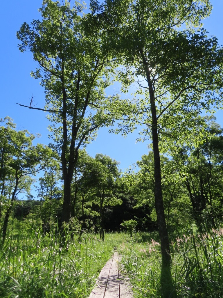 湿原に生えるハンノキの木漏れ日を感じながら歩くのも、気持ちの良いひととき。