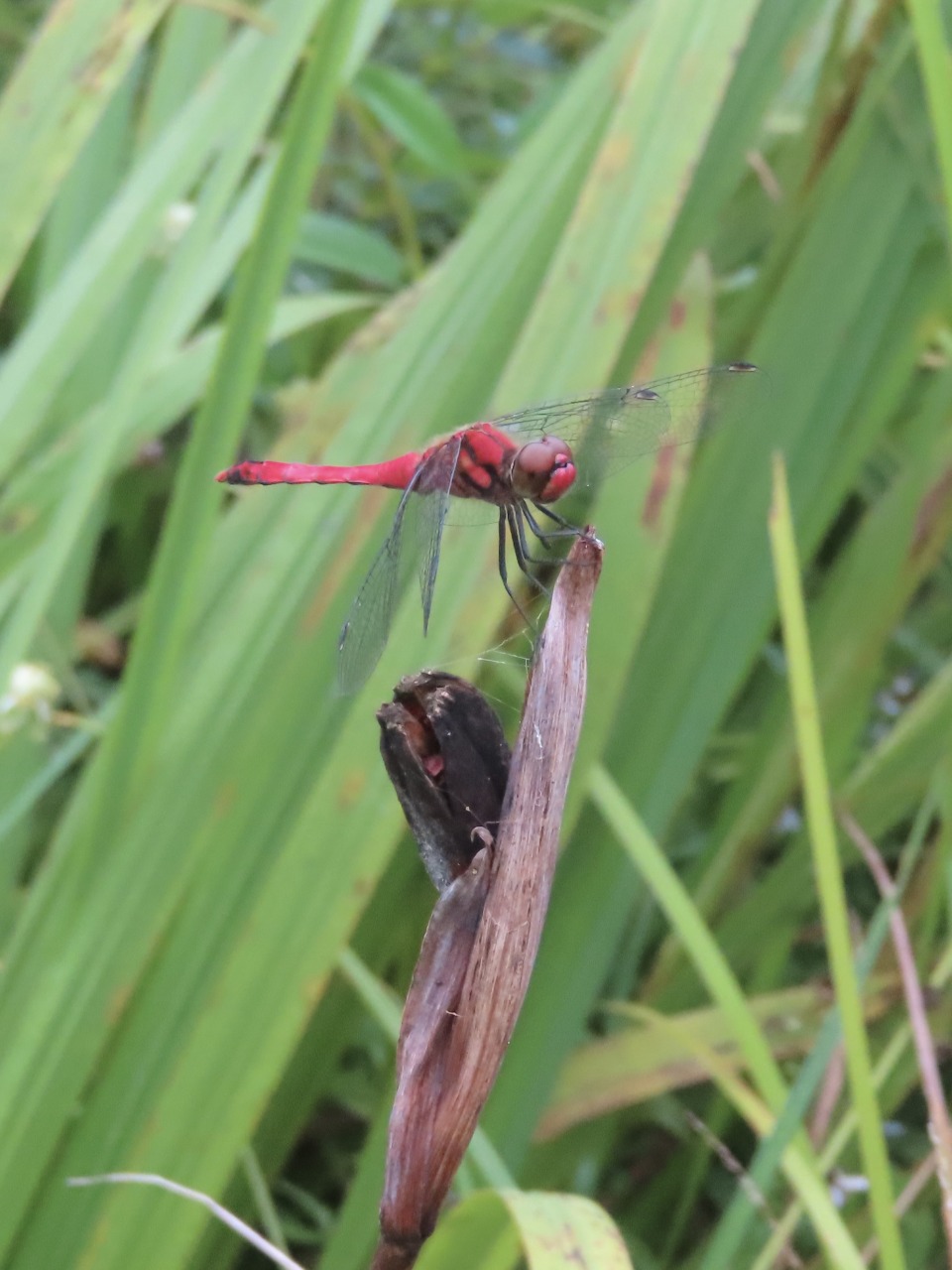 秋に見られる赤とんぼと呼ばれるトンボの中で、全身真っ赤になるのは「ナツアカネ」のオス。