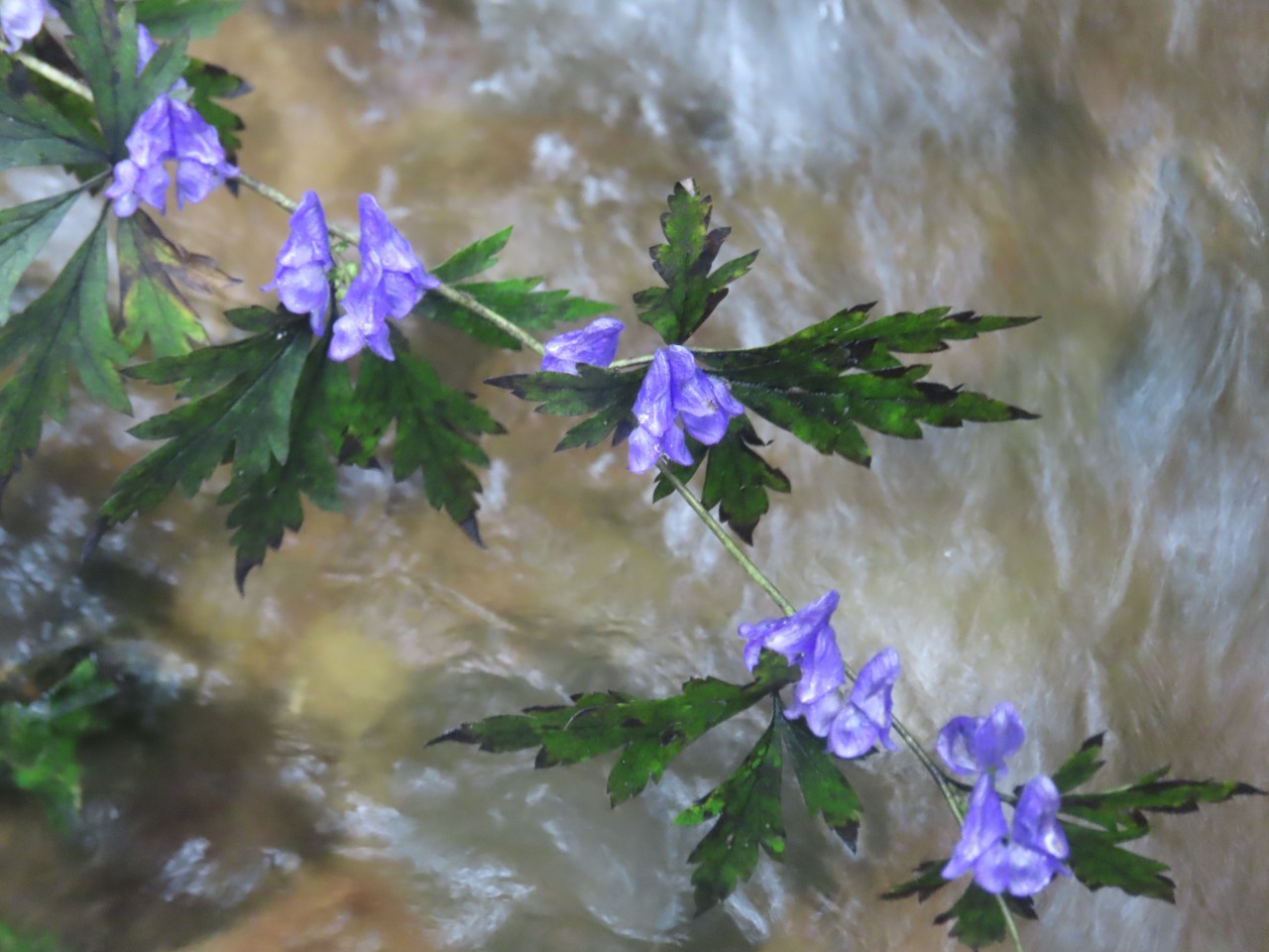沢の中洲で咲いていたのは、紫色が美しいタンナトリカブト。花、葉、茎、根、全てに毒を持つ毒草でもある。